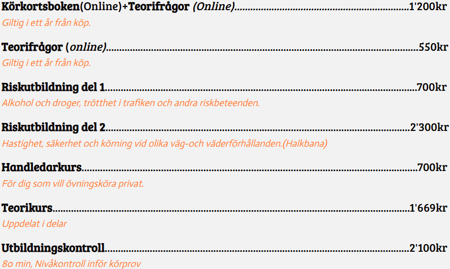 Vi erbjuder körkortspaket till förmånliga priser! Välj från tre storlekar där allt ingår. Det enda som skiljer paketen åt är antalet körlektioner, alltid anpassade efter dina tidigare erfarenheter.Oavsett om du behöver det största körkortspaketet eller det minsta så kommer vi alltid att leverera en undervisning av högsta kvalitet med fokus på dig och dina behov. Du kan enkelt och smidigt lägga upp en avbetalningsplan som möjliggör en lättare väg till ditt nya körkort